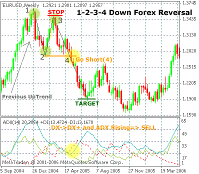 A 1-2-3-4 reversal chart pattern is build up of 4 definable points, known as point 1, 2 , 3 and 4. A typical 1-2-3-4 chart pattern is best traded after a strong currency pair up - or downtrend and can be defined by an easy set of trading rules. A trader can confirm the reversal trade using a technical indicator such as DMI or MACD.