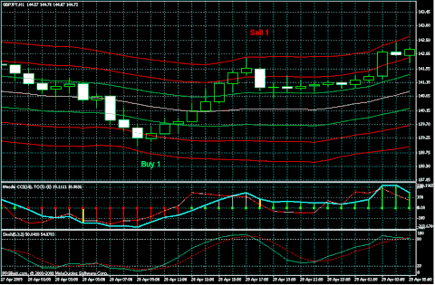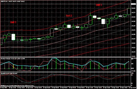 Another Sell signal at Sell 3 occurred at on April 29 at 15:00. The entry price was 143.10 with a stop loss of 144.05. This trade reached the yellow midline before reversing. The first half was close at 142.20 plus 5 pip spread for a profit of 85 pips and the stop loss moved to 143.00. The second trade was stopped out for a gain of 10 pips.