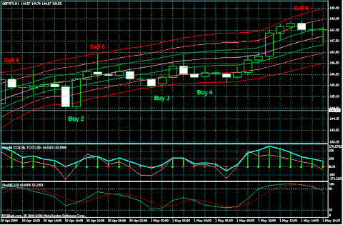 On May 1 at 6:00 there was a Buy signal at Buy 4 at a price of 146.18 with a stop loss of 145.71. I again considered this too tight so set the stop loss to 145.28. When price reached the midline before the European Open I closed half the position at 146.85 for 67 pips and moved the stop loss to 146.28. After the large move I modified the stop loss to 147.21, about half way down the large candle. The trade exited at Sell 6 price of 147.99 for 181 pips on the second half of the trade.
