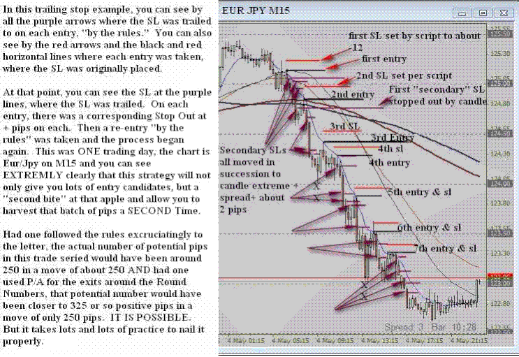 4. KEEP THEM TIGHT!: During a move, keep the SL reasonably tight. Meaning move it to the bottom (or top) of the last bar each time one closes until you get strong with this strategy. This is especially important with ANY sort of P/A bar that might indicate a reversal, Tighten to the close of the P/A Bar immediately!